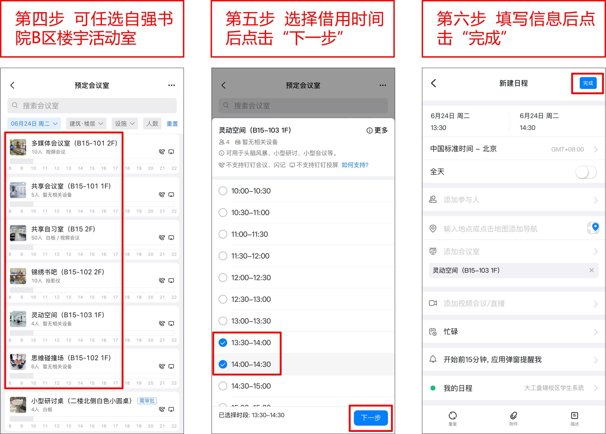 为避免活动发生冲突,使用公共空间需提前预约。可通过大工盘锦校区学生工作微信公众号中自强书院模块进行预约,预约时填写使用时间、活动内容、参加人数等信息。预约成功后,需按时使用,如有变动需及时取消预约。
