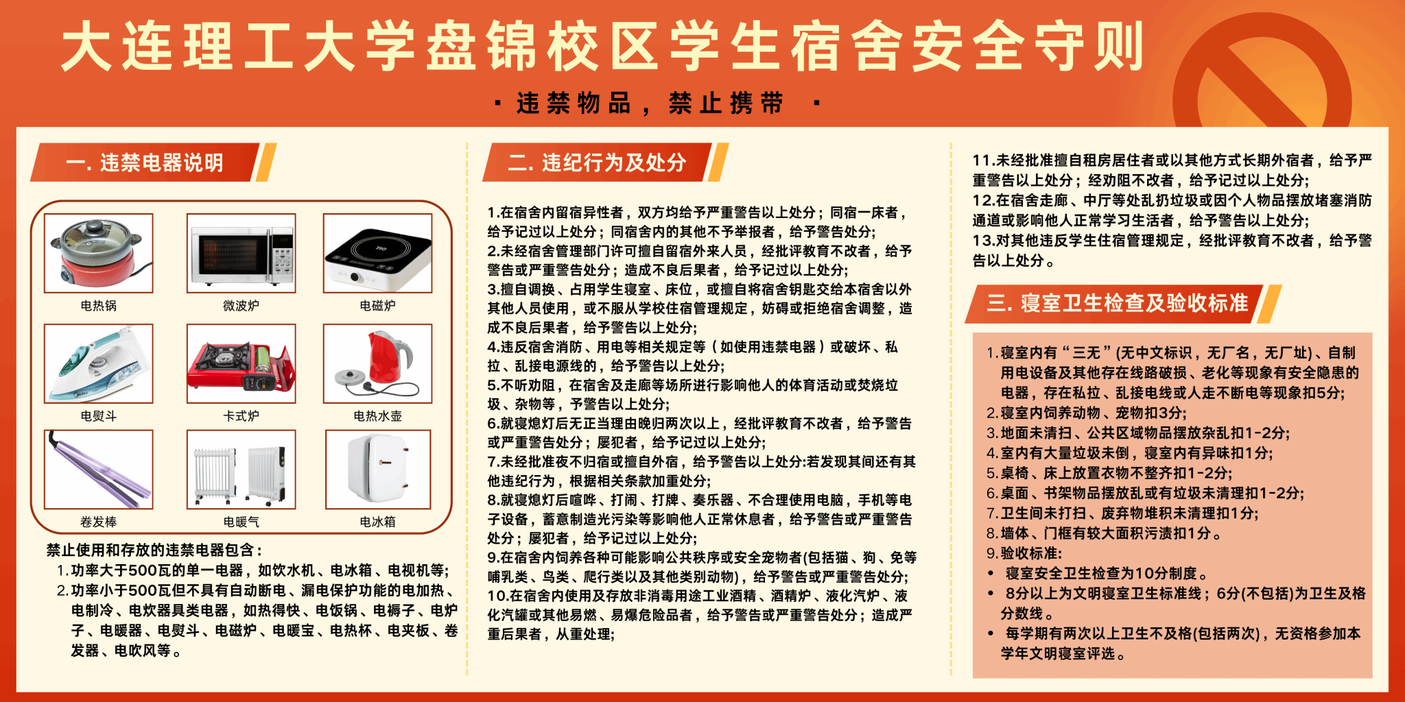 4.请自查并清理违禁电器,一经发现,将严格按照相关规定处理,详见《大学生手册》中住宿管理规定;
