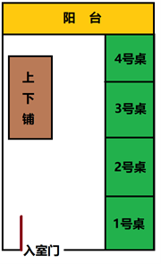 桌位划分:从入室门开始至阳台窗,序号分别为1、2、3、4号,拐角寝室为顺时针分别为1、2、3、4号。