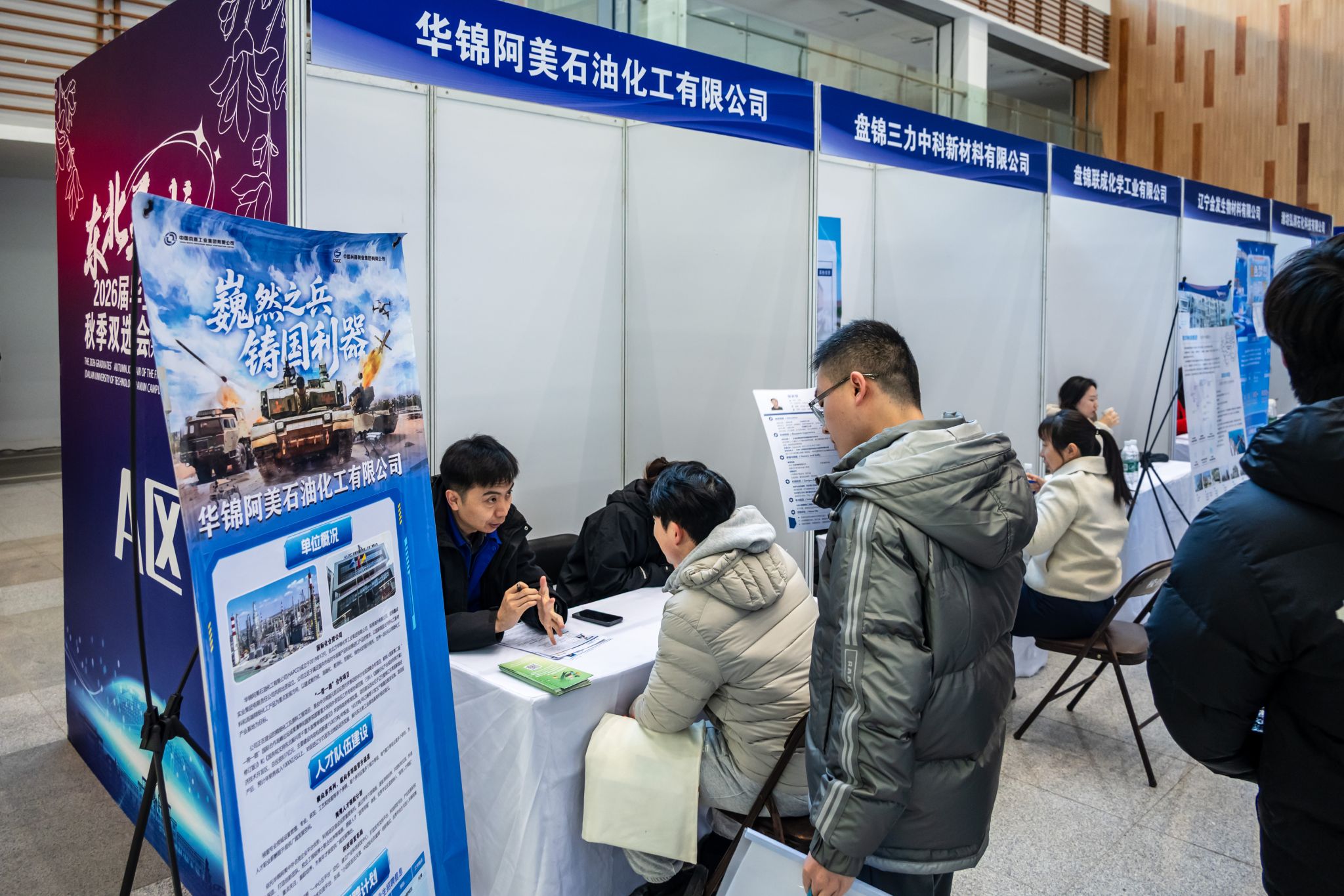 此次参会企业涵盖国防军工、化工材料、装备制造、生物医药、食品环境、信息技术、教育科研等多个领域。首次设立“盘锦招聘专区”,华锦集团、金发科技等属地大型企业均响应参会。同时邀请属地政府部门参会,为同学们介绍留盘政策福利,推动学生留辽留盘。