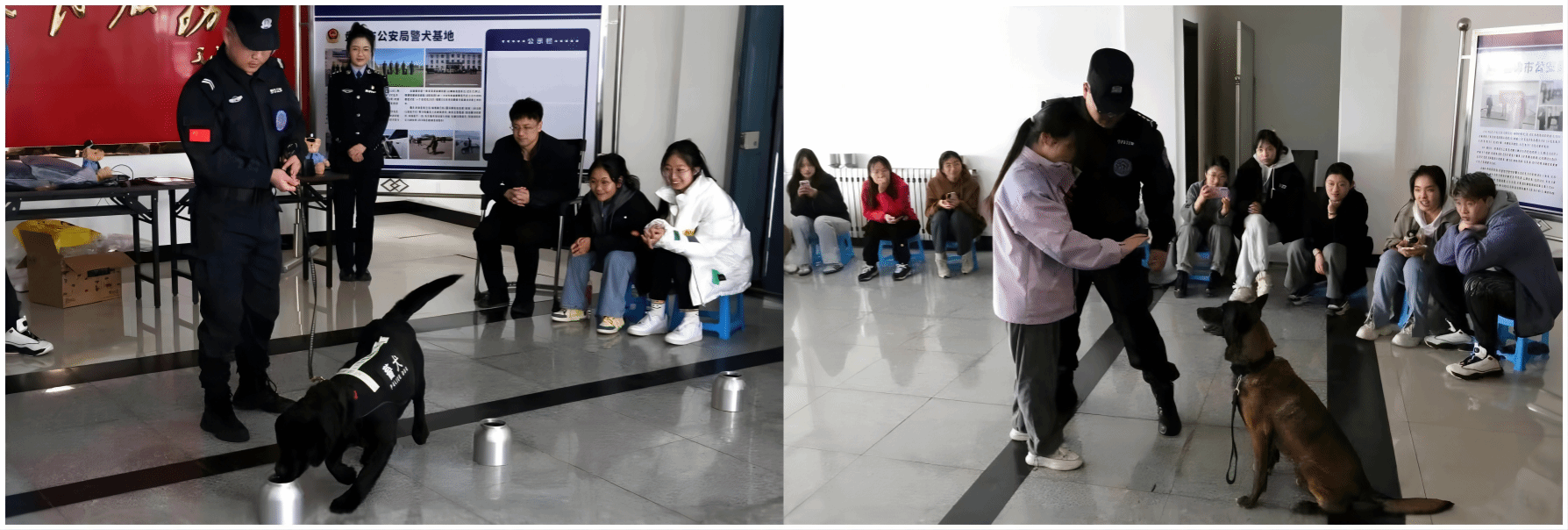 警犬是警察忠诚的伙伴,明星警犬“肉串”和“小白”与训导员展示了众多项目。在训导员传授与警犬互动的简单指令技巧后,现场的同学踊跃报名,测试自己能否指挥“小白”听从口令。尽管学生手中拿着诱人的零食,但“小白”不为所动,始终专注于训导员的一举一动。简单的互动背后,凝聚着训导员和警犬之间长期的艰苦训练与相互陪伴。