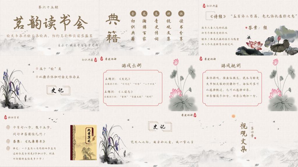 文化典籍浩浩汤汤,经史子集葳蕤生光。本期茗韵读书会便以“文化典籍”为主题,从初识典籍、瀚游百家、青史传词和视观文集四个方面,畅聊经史子集,传唱历史回想。且随茗韵,收百世之阙文,采千载之遗韵。
