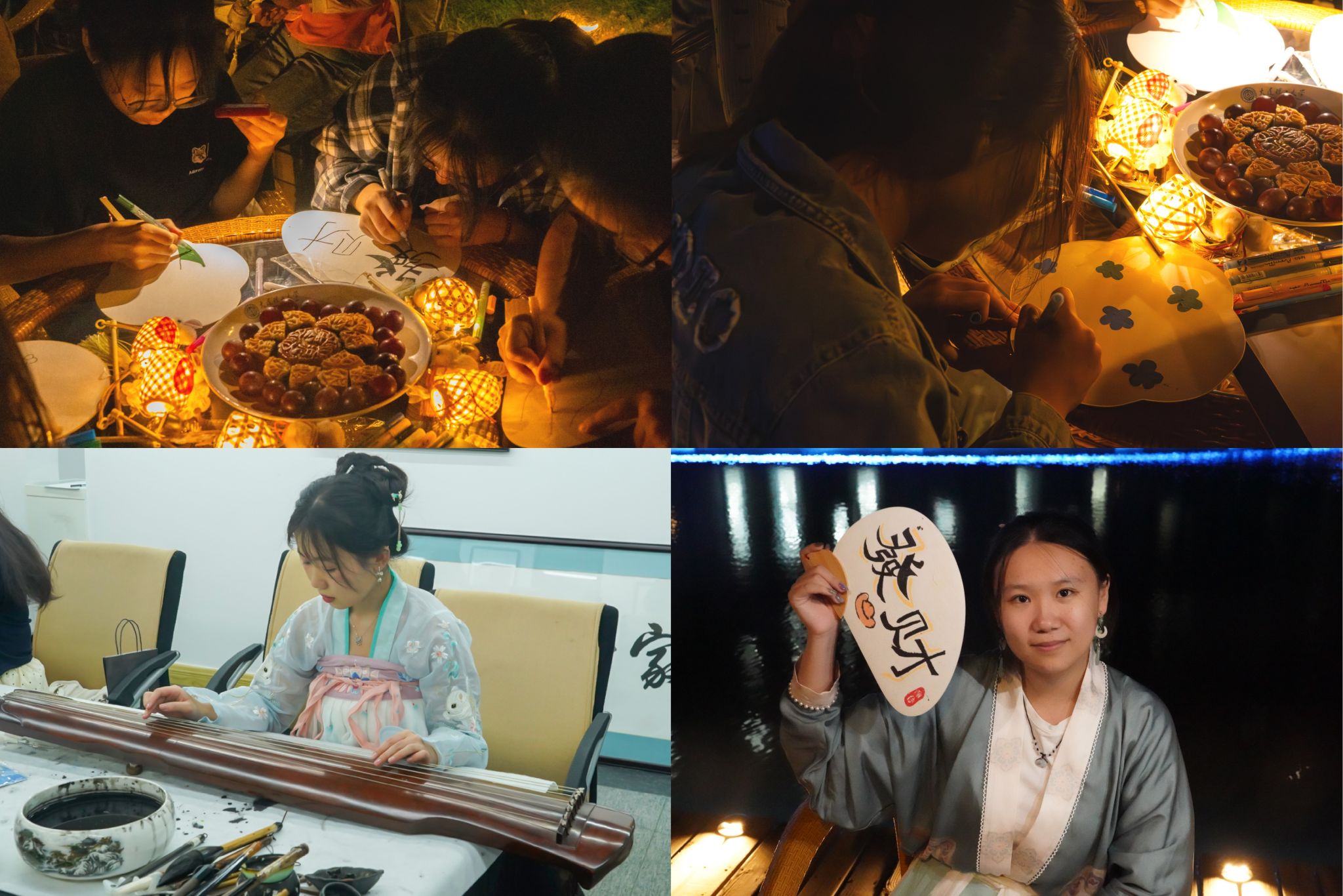 海上生明月,天涯共此时。翰墨书法社和逸轩美术社开展中秋传统文化体验活动。书卷画纸次第铺开,社团成员们身着汉服,带领着参与活动的同学们或笔墨舒展,或抚琴吟唱,或望月抒怀,或品鉴美味,现场活动形式丰富,仪式感十足。华裳之美,古乐之声,彩绘之趣,书法之韵,灯笼之巧……都融入这幅熙熙画卷之中,汇成独属于校区的中秋之韵。