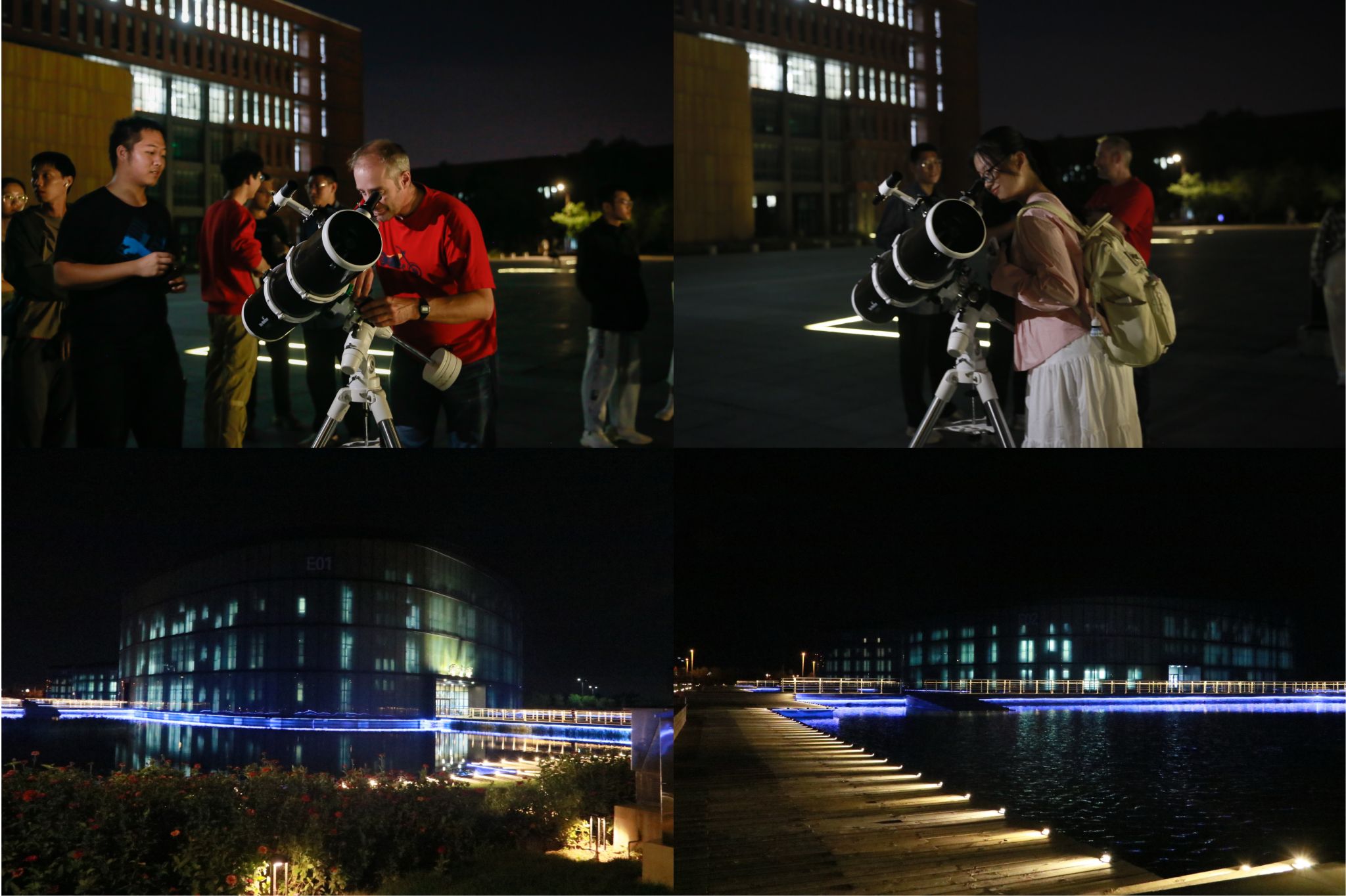 银河无声闪烁,天地同频呼吸。天文与地球科学协会在A01东广场架起了天文望远镜,用专业设备共赏圆月。阑珊的E区水系灯光与皎皎月光同辉,照亮了校园的夜空。